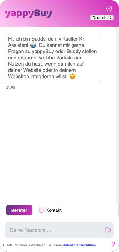Wenn du den „Berater“ aktiviert hast, kannst du auch einen Button im Buddy Chat aufnehmen, der sich „Berater“ nennt. Dann öffnet sich links vom Chat-Fenster ein weiteres Fenster, in dem ein Video, Produktkategorien, Preise, etc. eingefügt werden kann und somit auf der Website sichtbar sein werden. Bitte beachten: Im Mobile View überlagert das Berater-Fenster das Buddy Chat Fenster. Weitere Erklärungen zu Berater werden im Bereich „Berater“ erklärt.